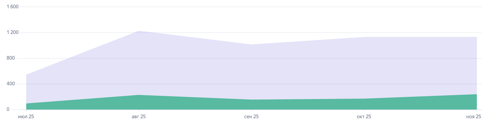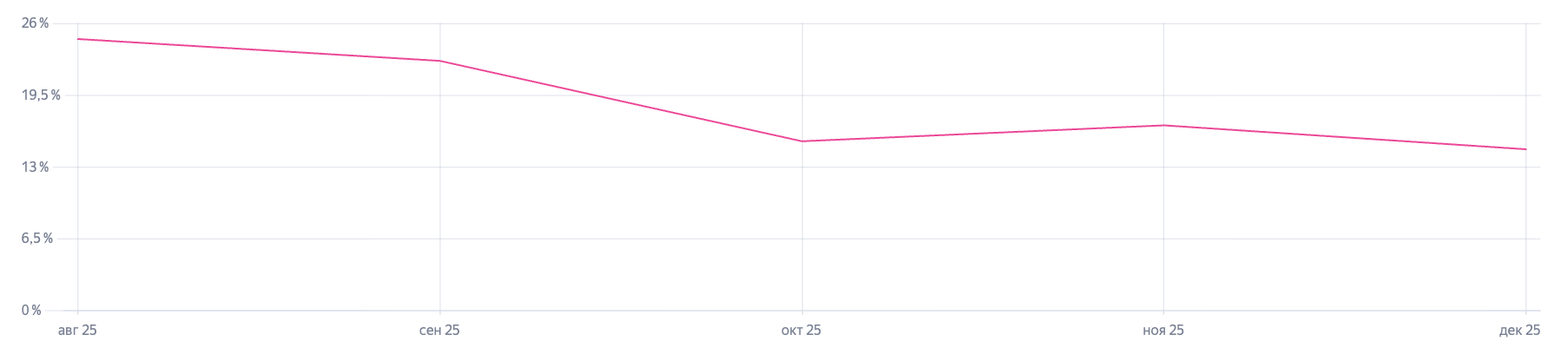 За отчётный период уровень отказов из поиска снизился с 25% до 14%. Динамика подтверждает рост релевантности страниц под поисковые запросы и улучшение пользовательского опыта.