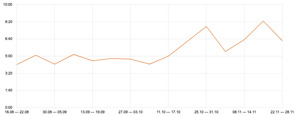 Помимо результатов по трафику, мы работали над конверсией сайта. Постоянный анализ аудитории, исследование конкурентов и соответствующие корректировки на сайте позволили увеличить время на сайте с 4:10 до 6:29.