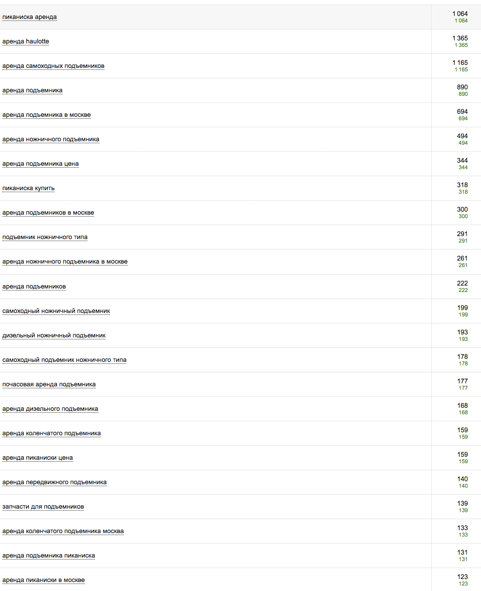 Сайт находится на первой странице поисковой выдачи Яндекса по ряду ключевых высокочастотных запросов. Самые показываемы запросы напрямую относятся к деятельности компании, а общее количество показов по самому востребованному из них «аренда подъемника» 890.