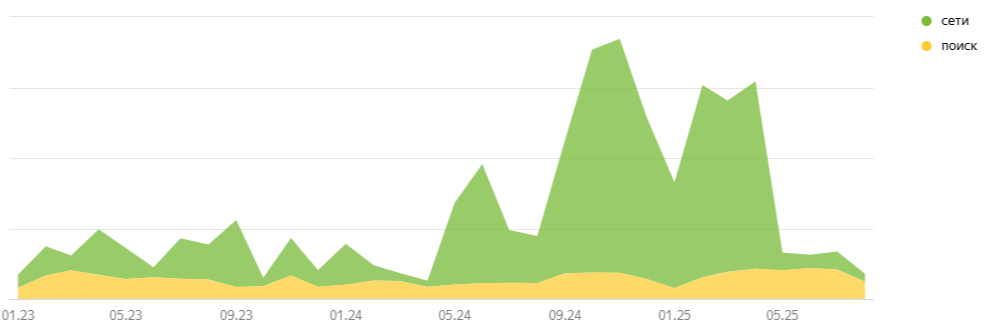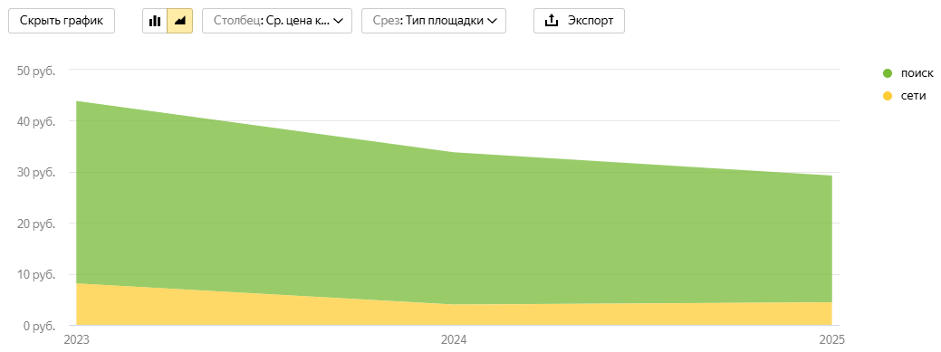 Поиск — статистика стабильна, наиболее целевая аудитория. Рекламная сеть Яндекса — клики по более широким фразам для охвата большей аудитории по меньшей цене. Сюда же входит кампания Ретаргет — для возвращения посетителей на сайт. С мая 2024 тестировалось увеличение трафика в РСЯ без значительного увеличения бюджета. С мая 2025 трафик в РСЯ уменьшен, акцент сделан на поисковых кампаниях.