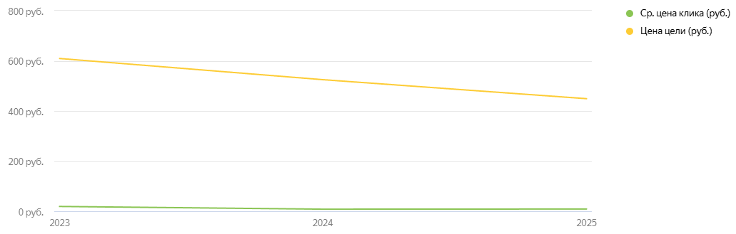 Данные за 2.5 года. График показывает плавное уменьшение цены цели (желтая линия) и снижение ср. цены клика (зеленая линия)