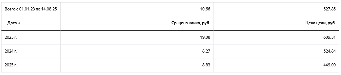 График показывает снижение цены клика за период 01.01.23-14.08.25 на Поиске и в РСЯ